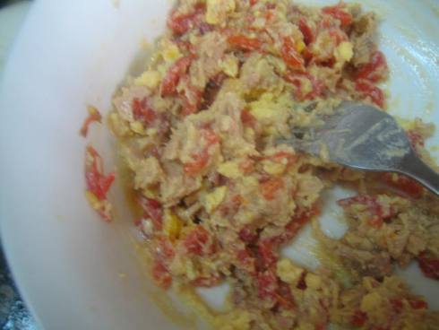 Las yemas restantes las aplastamos junto con el atún hecho migas, y el pimiento morrón picadito y un poco de salsa mahonesa. Mezclamos bien.