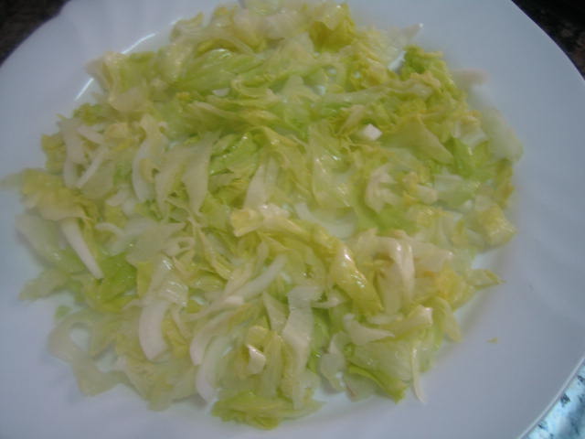 Lavamos escurrimos y picamos la lechuga. La colocamos en una fuente y disponemos los huevos encima.